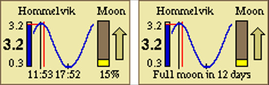 The tide window displays the nearest station for tidal measurements, the present water level, and the time for the next high and low tide.