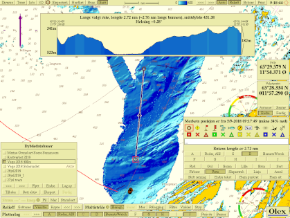 Til venstre dypere felt målt med Atec, mellom Vega og fastlandet. Fjorden rekker her ned til 523 meter. Legg merke til hvordan terrenget er hardere i sørlig halvdel, selv om dybdene er de samme.